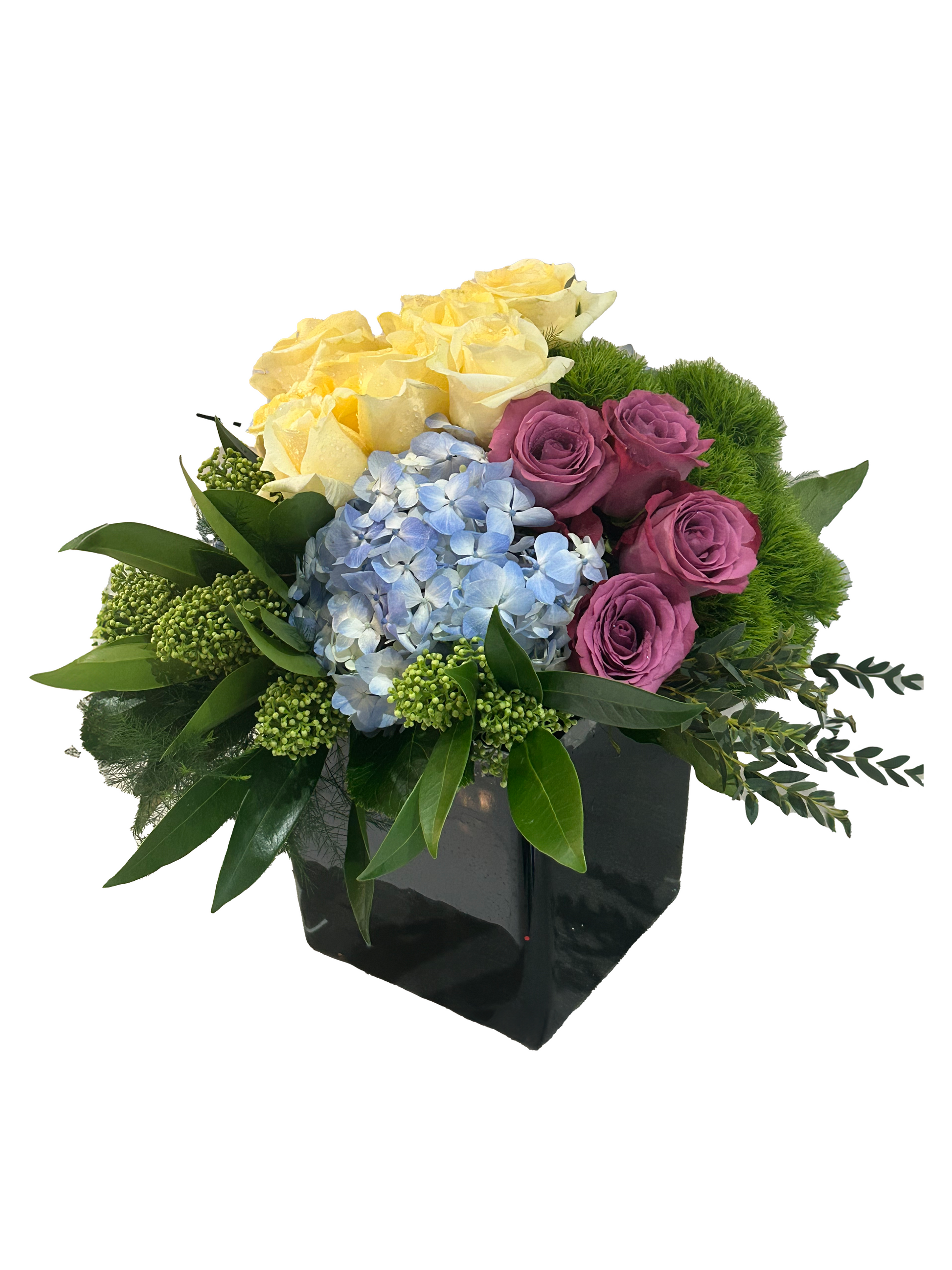 A sculptured grouping of golden and mauve roses anchored by blue hydrangea, vibrant green viburnum and green dianthus. Designed in a sleak black glass cube for a bold contemporary statement.